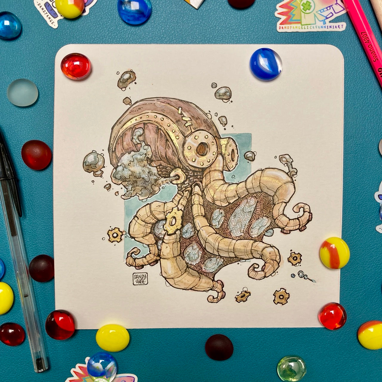 A mechanical being in the water: evolution mixed with a steampunk technology led to this fantastical creature, made of copper, leather and gears.